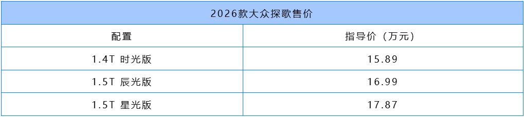 日前,一汽-大众2026款改款探歌上市,共推出三款配置车型,指导价格为15.89万-17.87万元。作为年代款车型,新车指导价格不变,主要针对配置进行调整。调整后,非全尺寸备胎的选装价格为200元;辰光版和星光版所搭载的1.5T发动机排量由1495mL变更为1498mL。