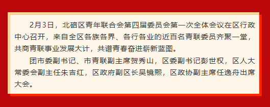 会议选举产生北碚区青年联合会第四届委员会常务委员20名,其中主席1名、副主席4名。